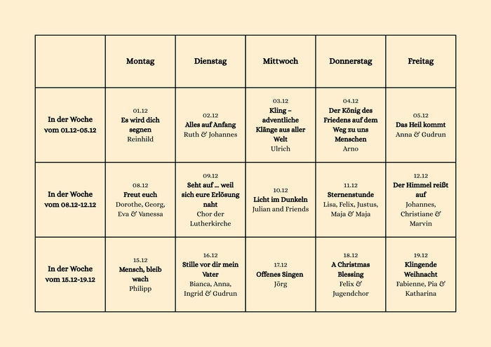 Ein herzliches Dankeschön gilt allen Mitarbeitenden, die den "anderen Advent" mit ihren Ideen, ihrer Zeit und ihrer Liebe zum Detail gestalten. Durch ihr Engagement wird diese besondere Reihe jedes Jahr erneut zu einem Geschenk für unsere Gemeinde.