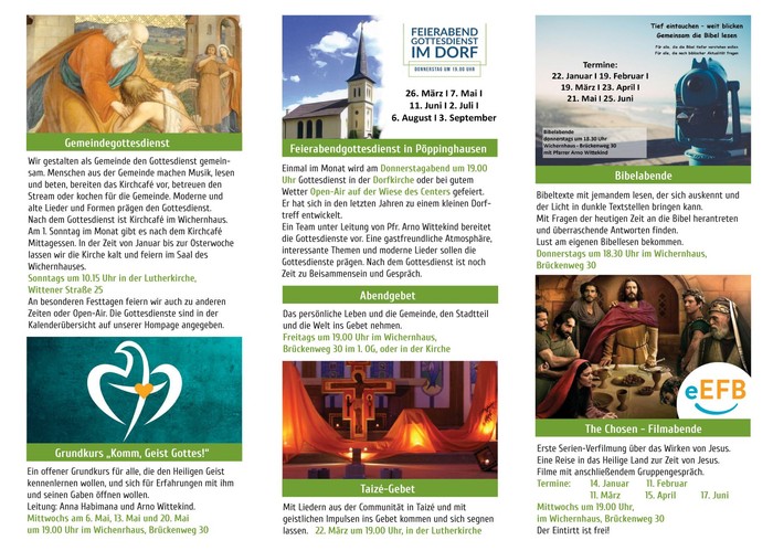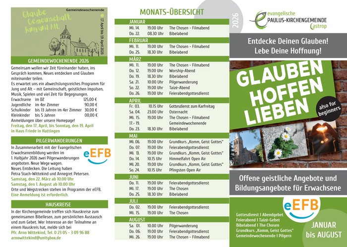 Zeiten des Gebets, des Singens und des Austausches über eine biblische Erzählung sind für uns wie eine Tankstelle für die Seele. Wir haben die geistlichen Angebote für das erste Halbjahr 2026 in einem übersichtlichen Flyer zusammengefasst. Schaut rein und wählt aus, was Euch gut tut.