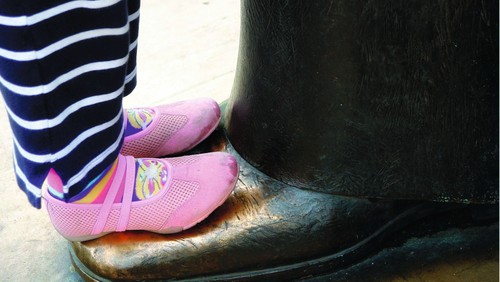 Kleine Füße auf großen Schuhen – so steht sie, vermutlich ein Mädchen, auf der großen Bronzefigur. Sie ist sicher nicht die erste, die so dasteht. Wir erkennen, dass die bronzenen Schuhe glänzen. Viele Menschen haben schon Bilder von sich gemacht auf den Schuhen der großen Figur. Man hofft auf ein wenig Kraft und Größe, also auf einen Anteil an der Figur, auf der man steht. Die Figur ist berühmt. Wenn ich auf ihr stehe, fällt etwas Glanz auf mich. Ich bekomme ein wenig von der Kraft des oder der anderen.
