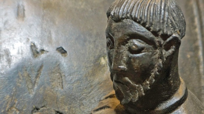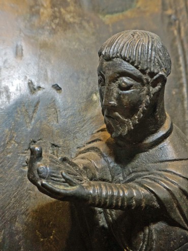 Wie demgegenüber tief empfundene Dankbarkeit aussehen kann, erkenne ich in der Darstellung des Josef, der eine Taube darbringt. Die Figur ist ein Detail aus der großen Bronzetür im Hildesheimer Dom. Bischof Bernward hat sie vor ziemlich genau 1.000 Jahren anfertigen lassen; und ich bin überrascht, wie ausdrucksstark die Figuren wirken, die im Dreiviertelrelief gefertigt wurden. Auf 16 Feldern wird einerseits die Urgeschichte von der Erschaffung des Menschen bis zum Brudermord Kains in Bildern erzählt, dem auf der anderen Seite die neutesta-mentliche Heilsgeschichte von der Verkündigung an Maria bis zur Auferstehung Jesu gegenübergestellt ist. Die Figur des Josef entstammt dem Feld, auf dem die Darstellung Jesu im Tempel gezeigt wird.